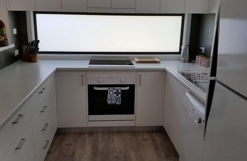 Internally the house revolves around a combined living/dining area that flows seamlessly onto the outside undercover entertaining area. It has quirky inclusions such as lead light feature windows and a feature wall lit by portrait lighting. A large comfy sofa, TV (Chromecast), Blu-Ray, DVD's and a stereo that is iPod and Blu Tooth compatible are supplied for your enjoyment, reverse cycle aircon for your comfort. An extensively supplied kitchen, is part of this great space. Inclusions are full fan forced oven, induction cook top, microwave, coffee machine (BYO Dolce Gusto pods) and dishwasher.