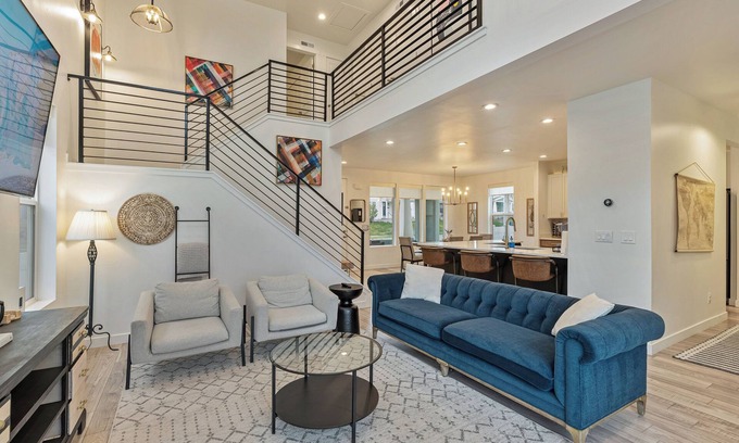 This stunning two-story 3-bedroom, 2.5-bathroom house in a sought-after neighborhood in West Jordan offers a comfortable and opportune living experience. Nestled by the Oquirrh Mountains, this home provides serene living with astonishing views. The West Haven Home is conveniently located near two major highways that provide quick access to all of Salt Lake County. Want to venture to downtown Salt Lake? Be there in 25 minutes! Prefer to navigate the outdoors? Take scenic walks around the neighborhood for surreal views of the Wasatch and Oquirrh Mountains. Enjoy a barbecue in our private backyard that features an outdoor grill and relax in a space that's equipped with comfortable outdoor furniture, a smokeless fire-pit, and a blooming garden. This upscale house features a master bedroom with a vaulted ceiling, a brand-new designer tile shower, and a large walk-in closet. The kitchen is designed with black stainless steel appliances, quartz countertops, and soft-close cabinets. The living room features 20-foot ceilings, designer furniture, and ample natural lighting.