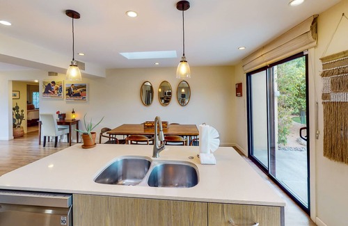 Comfortable furnishings offer plenty of seating in the airy living room. Curated decor and new furniture make this the ideal space to socialize or relax with a film on the 50-inch smart TV. A modern desk is handy for working remotely during your stay with the upgraded 1GB WiFi. The well-equipped kitchen features ample counter space and a full suite of stainless steel appliances - including a French-door fridge and gas range. Browse recipes at the kitchen island. The elegant dining area is the perfect space for meals and conversation. You also have the convenience of a private washer/dryer.