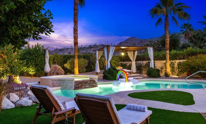 Classic 1930s design meets contemporary living at this upscale 1,380-square-foot bungalow in the desirable Araby neighborhood. A light-filled interior complements the backyard sanctuary with an optionally heated saltwater pool and spa. Stunning mountain views and glimpses of Bob Hope's former hillside hideaway await. Relax on the cabana bed beneath the shade of a pergola and commercial-grade misting system, or enjoy the perfume of the fruit trees. A gas grill, a stand-up bar with fire features, and a dining table set the scene for alfresco meals and outdoor entertaining. The front patio includes a charming bistro table with unobstructed views of Mount San Jacinto.