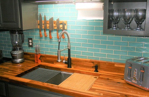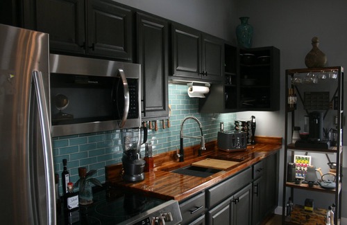 Posh, yet practical. Again, I put thought into every decision, researching what had the best reviews for comfort and functionality, while also balancing that function with form and design. I wanted to bring a little of the out side in, so I used a much more subtle grey, almost blue Pallet. Then painted the oak cabinets with the carbonized grey from outside. I then used cedar with the same stain for crown molding. For a focal point, I had a custom mural done on the largest wall. Its very thought provoking and perfect for the space which by the numbers seems small but with 12 foot high ceilings, makes it feel so much bigger. I built and installed custom Acacia wood butcher block counter tops, with a Kraus workstation sink That I believe was intended to give a farmhouse look, but it only lends to this funky design. It has a built in chopping block and dish drainer.
