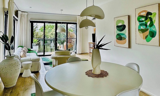 Stylish and instagramable townhouse, across the road from Mornington central shopping centre. 2 minutes to eateries, shops and bars of Main Street. No car needed. 5 minutes walk to beach. 2 bedrooms, queen size beds, with own bathroom access. 1 bedroom has bay glimpses. Return balcony with park views, generous courtyard for small dogs. Rooftop deck for sunsets and sunbathing, and stunning bay views. Fully equipped modern kitchen, coffee machine and secure lock up garage. Close drive to spas, hot springs , wineries of the Peninsula. Reverse cycle Air conditioning, free wifi and smart tv. Suitable for solo travellers, couples or small families. Small dogs are permitted.