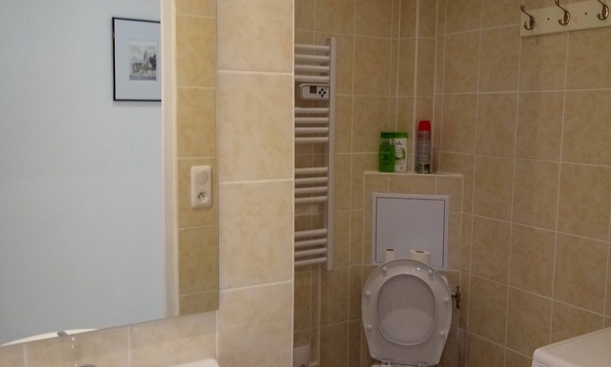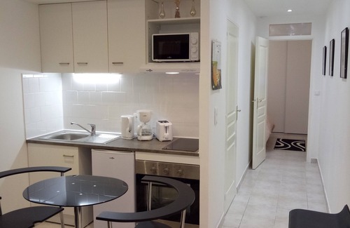 On the garden level of a house - charming new fully furnished and comfortable apartment including a living room open to a fitted and equipped kitchen (oven, microwave, ceramic hob, extractor hood, fridge, coffee maker, kettle, toaster , sufficient battery and cooking utensils). A corridor leading to a shower room with WC equipped with washing machine, hairdryer and other toiletries. A bedroom with fitted wardrobes, desk and equipped with flat screen TV and furniture. A living room furnished and equipped with flat screen TV with stereo.