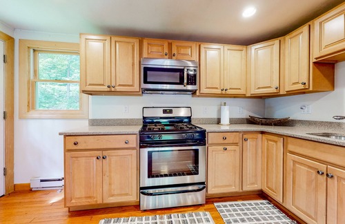 Bordered by Jamaica State Park, Potter's Place offers a charming and private retreat for outdoor lovers and adventure enthusiasts! Adorned with warm wood finishes, bohemian decorations, and plush furnishings - the interior of this home is one of pure peace and utter relaxation. Movie viewings can be enjoyed in the sun-filled living room complete with an oversized sofa, gas fireplace, and large TV. The adjacent well-equipped kitchen presents a pleasant space to play chef with its stainless steel appliances and ample meal prep space.