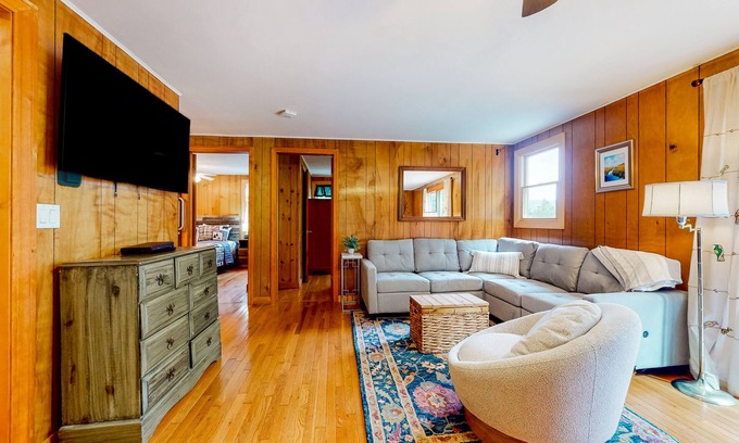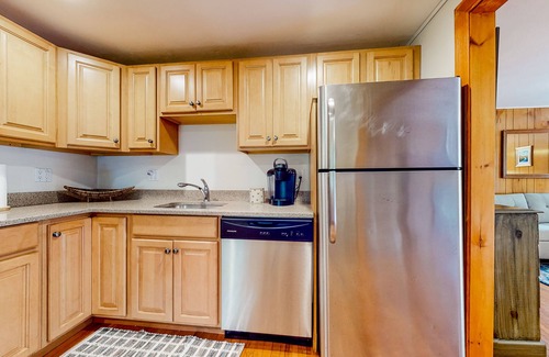 Both of the home's bedrooms come well-prepared for a restful night's slumber with soft quilts. Additional interior perks include a private washer/dryer and board games.