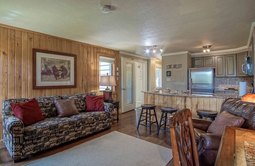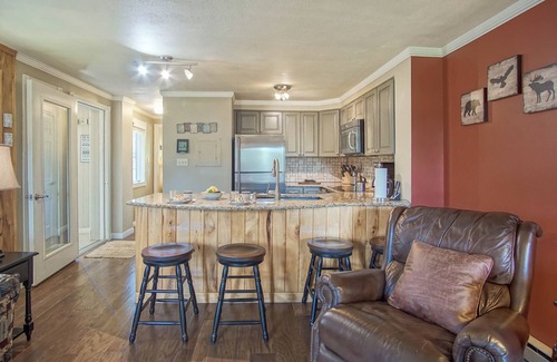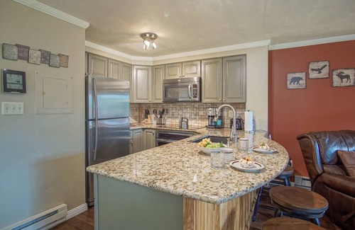 POWDERIDGE #44- 1 BEDROOM, 1 BATH FLAT-BEDDING: QUEEN BED AND QUEEN SLEEPER SOFA. This residence combines the warmth of a spacious home with the simplicity of a one-bedroom layout, The full-sized kitchen features ample space for family cooking. Equipped with stainless steel appliances and expansive granite countertops, the kitchen is both functional and elegant. Throughout the home, rich dark wood floors add a touch of sophistication. The upgraded tile bathroom enhances the home with modern design and high-quality finishes. The unit does have a washer and dryer. Powderidge 44 welcomes pets (2 medium-sized size, well-trained dogs) and offers the charm of a wood-burning fireplace, perfect for cozy gatherings.