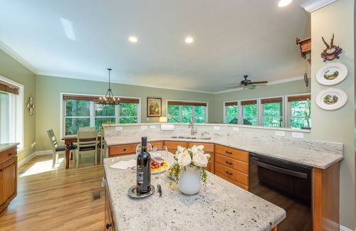 The main floor offers an open floor plan featuring a large fully equipped kitchen, outfitted with all major appliances – dishwasher, stove, oven, microwave, coffee maker, pots, pans, dinnerware, glassware, cooking utensils, and flatware are also provided. The dining table comfortably seats eight, and there are three additional seats at the kitchen counter breakfast area.