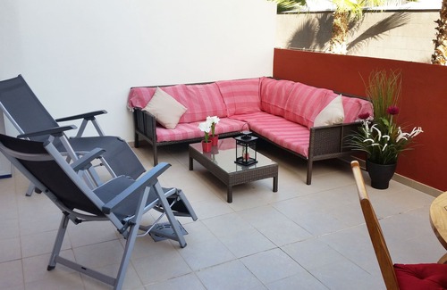 Our vacation rental home in Puertito de Güimar is located on the seafront, very close to the beach promenade and the artificial black sand beach. It is located at a ground level and has a bedroom with direct access to the spacious terrace, bathroom, living room with sofa bed for 2 persons and an open, fully equipped new kitchen. The large terrace with sitting area and dining table offers a partial view of the sea. The property is newly furnished and fully equipped. Wifi access and 2 Smart TV (no satellite connection) are also available free of charge. It is bright and quiet and is located in a well kept complex with a community pool. Underground parking space free of charge.