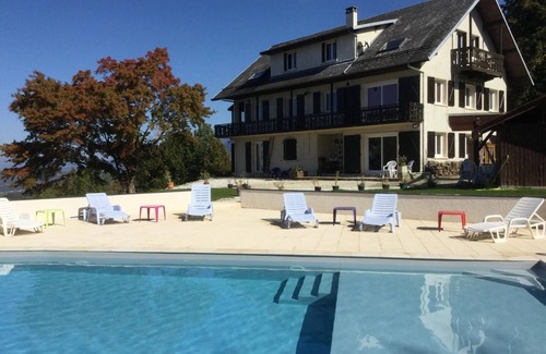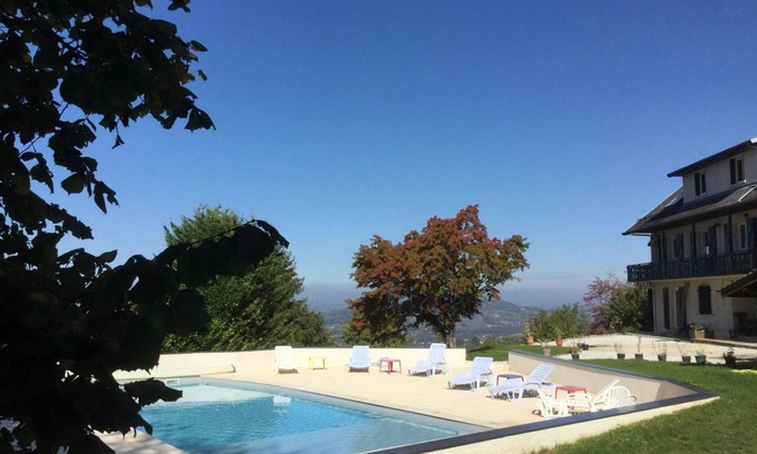 4 gîtes in the owner's house. Ground floor: kitchen, living room (1 double sofa bed 160x200 cm), 2 bedrooms including 1 cabin without opening to the outside (1 double bed / 2 single bunk beds), bathroom (bath) . On the ground floor, shared laundry room in the boiler room (washing machine and dryer). Terrace + courtyard + common grounds. Shared and heated swimming pool open from mid-June to the end of August. Lawn bowling. Summer kitchen with wood oven. Flag of character in the Aix countryside along the Revard, in the Regional Natural Park of the Bauges. Southwest exposed very quiet residential hamlet. Nice unspoilt meadows, hills and forests. Beautiful private terrace. Beautiful outdoor space very neat and flowery with swimming pool, bowls and summer kitchen. Superb very clear view of the countryside.