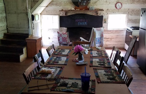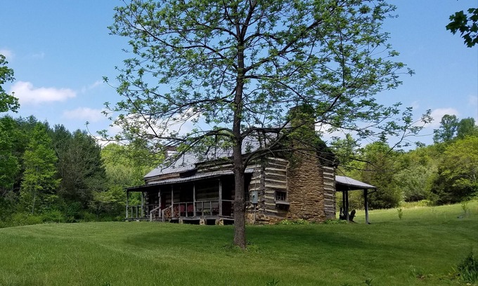 Maggie's Farm is a RUSTIC country log cabin that was built in the 1840's and has been kept largely as it was built, in a "dogtrot" style. If you seek a quiet, UNPLUGGED getaway in which to relax, rest and enjoy old-fashioned family time, you need look no further. WE ARE A DARK SKY DESTINATION. Maggie's Farm has a working fireplace in the kitchen a large stocked, family-style kitchen and living area, with two sleeper sofas. A full bath is on the main level as well. Upstairs is a master bedroom with queen and single bed, and a bunk room with queen, double and three single beds. Located on 30 acres with two creeks on the property, as well as trails to walk leisurely, porch swings to enjoy owls, turkeys, whipporwills and other birds and animals. Maggie's Farm is a step back in time to a slower, gentler way of life. A large fire pit for evening campfires awaits you, as well as horseshoe pit, badminton and a swing set for children after a wade in the creek. The cabin is 20 minutes from the Harvester Performance Center, roughly 25 minutes from Philpott Lake with Army Corp of Engineer swimming areas, and is about 30 minutes from Floyd, with its weekly music jams and popular Floydfest each summer, and the Blue Ridge Parkway is ten minutes away as well. The cabin makes an ideal gathering point for family reunions and , football weekends at Virginia Tech, , and it has a 20' x40' covered, lighted outdoor pavilion. It is five minutes from Ferrum College, and is on the Crooked Road Music Trail. Spring and fall are especially pleasant, with cool mornings and evenings to experience.
