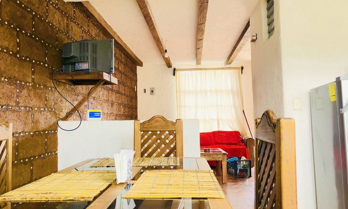 Comodo Depa 2 habitaciones: 1 con cama matrimonial y otra con 2 camas individuales. Cocina equipada comedor con 6 sillas, sala con comodos sofas, TV con cable, wifi y estacionamiento. Hasta 4 personas caben bien.