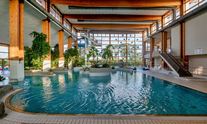 An indoor pool, a children's pool, a seasonal outdoor pool, and a hot tub are on site. Other recreational amenities include a waterslide, a sauna, and a fitness center.