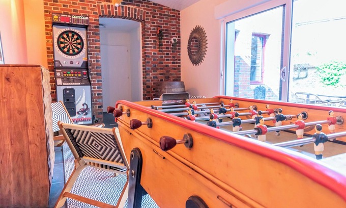 - A games room with table football and darts.