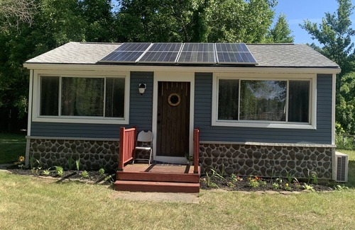 view of the bike path from front window. has a doubled shower so enjoy the streams of hot water after a bike ride or a swim at the beach which is a five min walk from location. TV and Bluetooth stereo system, full kitchen with stove, toaster oven waffle machine and fridge. Dollar General 2 min drive. Grocery store 7 min drive. party store 1 min walk, bar 4 min walk. Access to 3 kids and 1 adult kayaks with full wavier. Green energy. It's a real relaxing atmosphere. Five pound bass are found in this lake as well as some big catfish. Deepest inland lake in Michigan. when its 90 out its a refreshing swim. kids can go turtle hunting and pick shells from the beach then take a bike ride down the fitness path that connects another two lakes. The bright stars at night make for a soothing romantic peace. For the outdoors we have a fire pit, bbq and picknick table