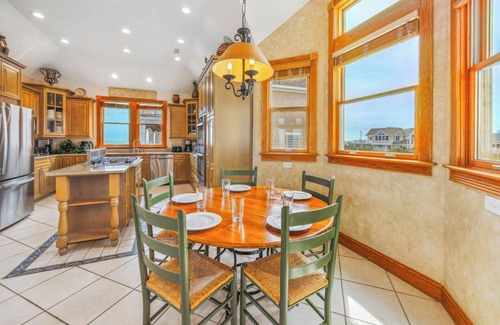 OCEANFRONT Avon - Ocean Isle Estates - BRAMASOLE is a Tuscan term which means to yearn for the sun. Relax in this thoughtfully designed 6,700 sq. ft. home, with five separate living areas and furnished decks on every level, offering plenty of room for your group to gather and enjoy the magnificent beauty of the beach. Conveniently, all bedrooms are masters, including one handicap friendly king master on the ground level with roll-in shower. In addition, the ground floor offers dry entry through the carport, a second king bedroom, a third bedroom with two pyramid bunk beds and a large recreation room with custom pool table, elliptical exercise machine, Smart TV, surround sound home theater, stereo with Bluetooth speakers to pool, kitchenette with full size refrigerator, microwave, dishwasher and ice machine, and convenient cabana bath with outside entrance for those wet little feet. Step outside to enjoy the large granite pool with separate kiddie pool, oversized 8-person hot tub, outdoor shower, foot wash and outside gas and charcoal grills under pergola. Also enjoy the expansive pool area along with poolside tiki bar for outdoor entertaining. Step up onto the second level for four more bedrooms, a comfortable library with books, TV and internet access. The movie buffs can escape into the media room with blackout shades, 80" TV, Roku streaming, stereo/CD, and surround sound. If you're still yearning for more, the best is yet to come with the third level's spectacular great room with both ocean and sound views, vaulted ceilings, large dining room, breakfast area, half bath, king master suite, gourmet stocked kitchen with double appliances and everything the gourmet chef might desire. Enjoy the 40" Smart TV with surround sound, TV, and stereo with Bluetooth speakers to tower room and decking. Venture up to the top-level tower and enjoy the breathtaking views in a large sitting area with yet another wet bar. After a vacation at BRAMASOLE, you are left yearning for nothing but to return next season. (Fireplace in pictures in great room is not for guest use).