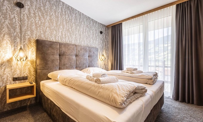 In our 67 to 78 m² premium apartment with 2 bedrooms, as many as 4 to 6 people will feel completely at home. Your holiday apartment features 2 bedrooms, 2 bathrooms with WC / shower (hairdryer), a living room, an open kitchen and a balcony. You will be sleeping on comfortable double beds. In the living area, there is also a double sofa-bed sleeping 2 additional people. The kitchen is fully equipped. In other words: Kitchen amenities include cutlery, crockery and pots & pans, a ceramic range, oven, microwave, dishwasher, refrigerator with freezer, along with other appliances such as a toaster, electric kettle and coffeemaker (capsule (Nespresso) machine). A small ALPS RESORTS starter set including dishwasher tab, dishwasher detergent (sample size), sponge, trash bag, cleaning cloth and dishcloth is provided for you upon arrival. Each accommodation comes with an assigned parking space in the underground garage, where you can park your car during your stay.Wi-Fi is included. All pictures are intended as examples only. Each unit is individually furnished.Zillertal Suites Fügen by ALPS RESORTS: •Holiday apartments in Fügen im Zillertal, Tirol •Wellness area with heated outdoor pool and saunas •850 m from “Spieljochbahn” cable car, 750 m from the thermal spa “Erlebnistherme” •Guest card Erste Ferienregion Zillertal included •Parkinggarage available (free of charge)