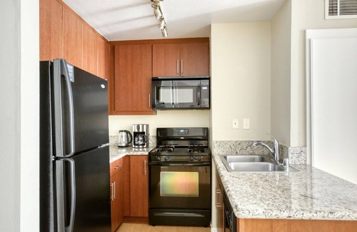 This furnished apartment is located in Burbank, a thriving city at the southeastern end of Los Angeles's Fernando Valley. This chic community located 12 miles northwest of Downtown LA has a spirit all its own. Burbank is the headquarters of both the Walt Disney and Warner Brothers studios, so creativity is a given here. Cool bars and cafes line West Burbank Boulevard, and the neighborhood is also home to one of LA's oddest attractions: the Bearded Lady's Mystic Museum. The diverse dining scene includes everything from American comfort food to Japanese to Thai. Anyone who loves to cook can fill up their grocery cart at Ralphs or Trader Joe's right in the area. Another local gem is the Urban Press Winery, which regularly hosts events and tastings on its lovely patio. While Burbank has its own train station, most residents rely on cars to get around.