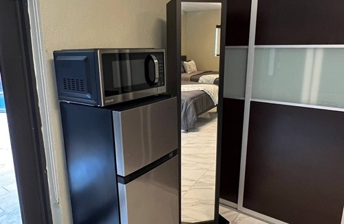 Unwind in Miami at this lovely hotel suites. This cozy space features 1 peaceful bedroom with 2 comfortable queen bed. The bathroom is equipped with a bidet, shower, and hair dryer for your convenience. Feel cool with amenities like an iron, hair dryer, washing machine, WiFi, and AC. Enjoy your time in Miami at our hotel suites. Pool, gazebo, basketball hoop, free EV charging station and much more