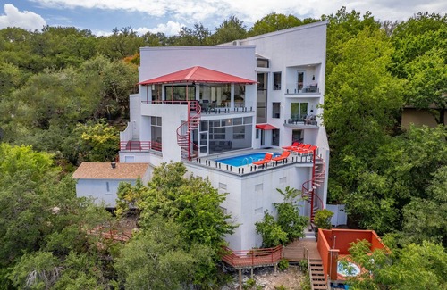 The Bluff House on Lake Austin has a swimming pool area overlooking Lake Austin with a large dock to swim off of with amenities such as a water slide, a boat slip, diving board, lake play pad to lay on and roped off shallow water area. It is about 20 minutes from downtown Austin. Property is very private with tremendous views up and down the Lake. Property is located by a very large park that has multiple trails for hiking. Great fishing off the dock also.