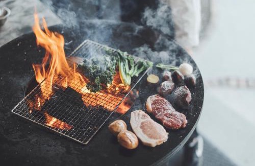 Premium villa glamping log cabin with stars and bonfire is located in Hokuto.