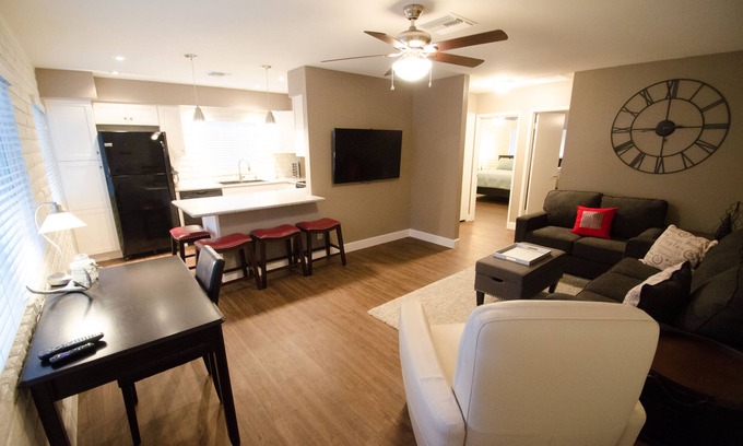 Updated 2 Bedroom, 1 Bath cottage (check out 7 neighboring Suites to this listing, VRBO listing 984590,988534,992379,992381,1172133,1172132,1172129,1171999). Located 1/2 mile from Historic Downtown Prescott Square. Brand new furnishing, appliances, and granite counter tops. Full kitchen, king-sized bed in master bedroom, 2 twin beds in 2nd bedroom and pull-out full mattress in the living room. Free Wi-Fi, flat screen Smart TV. Keyless entry to this 1 level condo (no units above), with central Heat/AC and on-site parking & laundry. Cycling, fishing, mountain biking, golfing, and hiking near. Courtyard with a picnic table for the enjoyment of vacation renters.