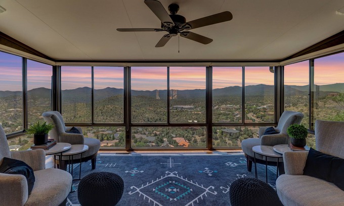Welcome to our luxurious mountain retreat in Prescott, Arizona! Nestled atop the picturesque hills, this fully renovated 4-bedroom, 2.5-bathroom house offers a truly breathtaking experience with endless views of the majestic mountain vistas. Prepare to be captivated as you step into every room, where the panoramic scenery effortlessly becomes a part of your living space.
