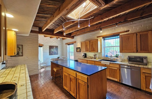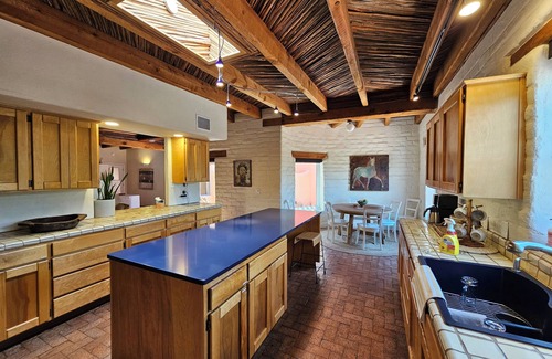 Stylish desert retreat on large quiet lot. Authentic southwest home with saguaro rib ceilings, adobe walls, & tasteful decor. 3 newer AC units for year-round comfort. Pool with in-ground hot tub, loungers and seating. Outside enjoy grilling and dining. Inside enjoy high quality beds and resort-grade linens. AZ TPT LICENSE #21546720.