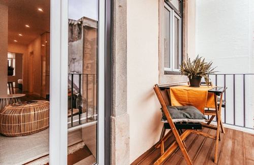 - Romantic balcony with a small dining table overlooking a typical Lisbon patio