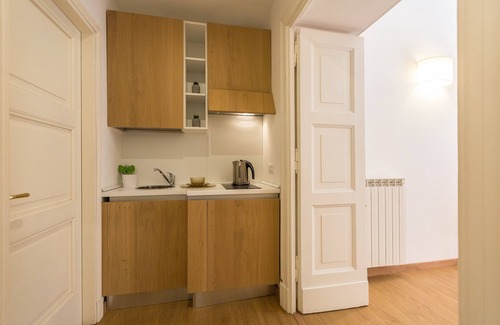 This spacious and elegant apartment is located at walking distance from the Trevi Fountain and the Spanish Steps and it is perfect for a big group of friends or for a family. It comes with 3 very large bedrooms, all of them have a small kitchenette and an en-suite bathroom with shower, sink, toilet and bidet. All the areas are very bright thanks to the big Italian style windows that overlook the elegant Via Barberini. The living and dining area features an equipped kitchen, a dining table for up to 6 people and a sofa.