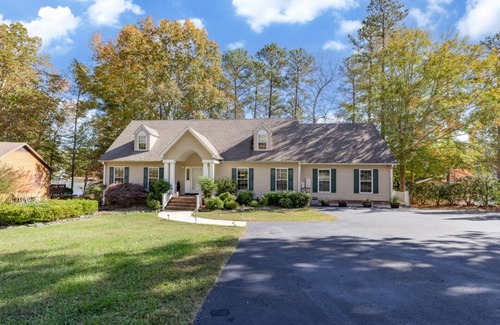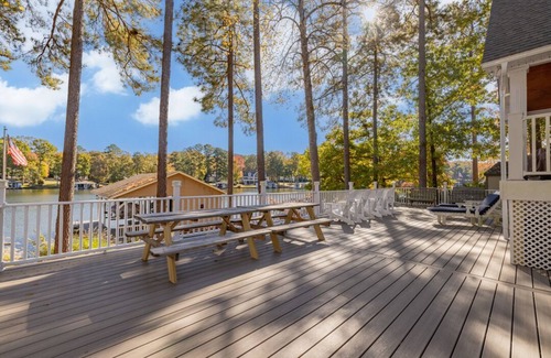 Escape to the serene beauty of Pretty Creek Retreat with our exquisite 5-bedroom, 2.5-bath vacation rental! Nestled in a prime location on Lake Gaston, this spacious retreat sleeps 18, making it an ideal getaway for family gatherings or group vacations. Immerse yourself in breathtaking water views from the comfort of the large covered lakeside porch and expansive decking, or step out onto the private second floor deck accessible from the lakeside bedrooms. The flat lot with a sandy beach area provides a perfect spot for relaxation and water activities.This beautiful lake house comes with an extra outdoor shower, adding a touch of convenience and indulgence to your stay. Rinse off after water activities or unwind beneath the open sky as you embrace the natural beauty around you.