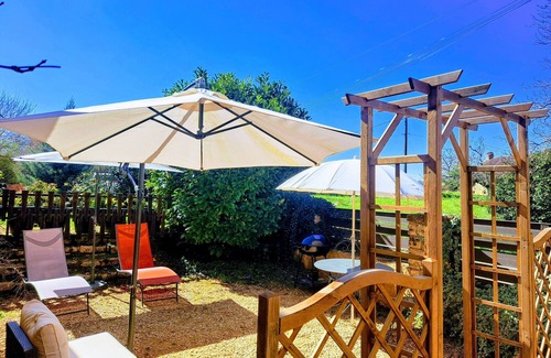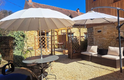 Gite 4 has its own garden terrace area, accessed through a wooden arch, with some privacy from the other gites. The gite has its own barbecue, outdoor dining table and chairs, outside sitting furniture, table with large parasol, and 2 sun loungers with a further parasol.