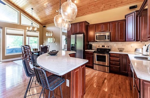 Featuring a spacious open-concept main floor, Prima Vista offers a gourmet kitchen complete with modern appliances, a large dining area, and two luxurious master suites with king-size beds. You and your guests can enjoy the oversized covered deck equipped with comfortable seating and an outdoor dining table, ideal for al fresco meals or cocktails as the sun sets over the lake. The lower level comes alive with a recreation area, wet bar, and additional bedrooms, ensuring everyone has a place to unwind. Whether you're grilling on the deck or celebrating with friends and family, this home is fully equipped for your wedding festivities.