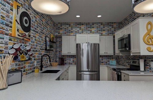 Experience this one of a kind, immersive, retro MCM, classic rock tribute! This groovy place is downtown, right in the heart of great shops, restaurants, breweries, music festivals, art, & fun events! Our nod to 60's & 70's classic rock & the optimistic culture around it is like nothing you've ever seen! Designed by musicians and music lovers, you'll be surrounded by nostalgia, unique graphics / prints, records, instruments, accessories, custom music lighting, furniture and more! But don't think its all design and no comfort! We've got a large Living & Kitchen area with plenty of comfy seating, large bathrooms, and roomy bedrooms with plush Queen size beds and ample storage! Stay with us & be wowed!