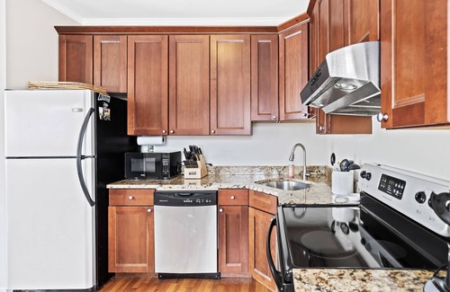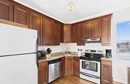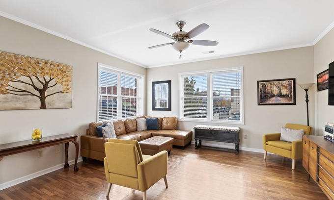 This beautifully updated apartment combines style and functionality, featuring an open living and dining area that fosters effortless entertaining. Delight in the hardwood floors, granite countertops, and stainless steel appliances in the fully stocked kitchen. You can also enjoy modern amenities such as a 55" Samsung smart HDTV with cable, DVD player, and complimentary Wi-Fi to keep everyone connected. Plus, your furry friends are welcome here—just let us know if you have a pet, as we do allow dogs with a nominal fee! The apartment's private parking spot adds convenience for you and your guests, making it perfect for post-wedding gatherings.