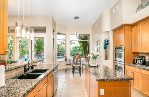 One of the many highlights of the Desert Flower is the resort-style backyard. The yard is beautifully landscaped and maintained and includes a large heated pool with a waterfall feature. The covered patio has plenty of seating complemented with a fire pit - perfect for cooler desert nights. There is a barbecue grill, an outdoor dining table, and plenty of seating for use!