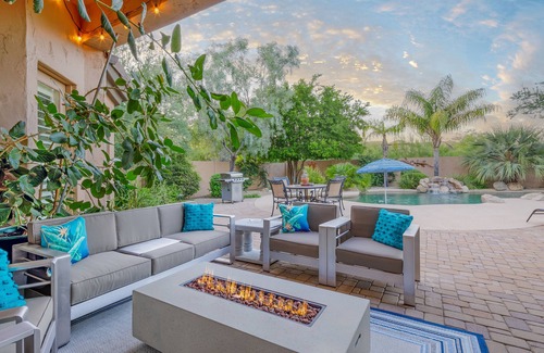 Escape to the beautiful Sonoran Desert and find your serenity at the Desert Flower home. Located just minutes away from popular shopping, dining, and entertainment districts, you will find endless things to do and explore during your stay. This bright home features four comfortable bedrooms, three full bathrooms, a fun game room, a relaxing heated pool, a covered patio with a fire pit, an outdoor BBQ, an upgraded kitchen, and much more!