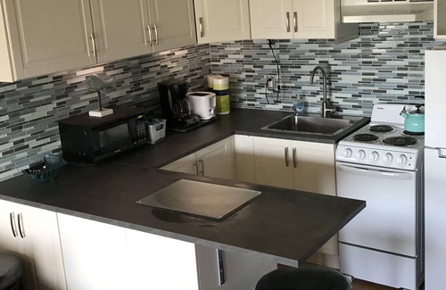 Very comfortable unit that has updated kitchen completely furnished with sink, stove, refrigerator, microwave, and all necessary dishware and appliances. Clean and well maintained.