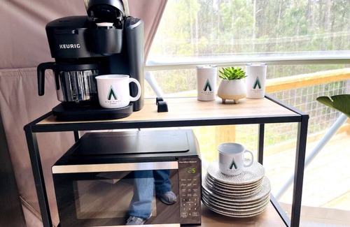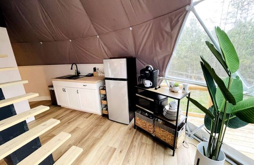 Enjoy a unique, luxury experience in nature in our private Princess Dome at Nine Pines Retreats! Step inside this fully furnished geo dome to discover a spacious retreat complete with kitchenette, heat and air, shower, toilet and the luxury heated jacuzzi tub. Lounge on the private deck complete with gas grill, blackstone griddle and pizza oven. Relax in the outdoor lounge area with firepit table. basking in the serenity of the valley of pines. Hiking trails and more available for your enjoyment
