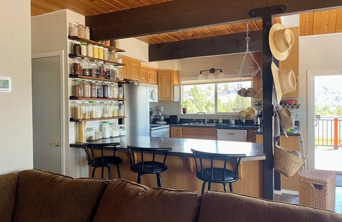 Located above the Prineville Reservoir with a 180° view of the lake and mountains. Only a 2 minute walk to the beach, and we provide kayaks, paddle boards, and beach gear for you! Beach is accessed by walking down our hill and across the road, or by walking/driving the brief distance to the lake.