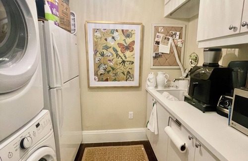 This condo is designed with your comfort in mind. Featuring two modern bathrooms, each complete with a shower and a hairdryer, you'll have all the amenities you need to feel at home. Plus, the convenience of an in-unit washing machine and dryer ensures that your extended stays are as hassle-free as possible. The Laundry also hosts a coffee bar, air fryer, and microwave.