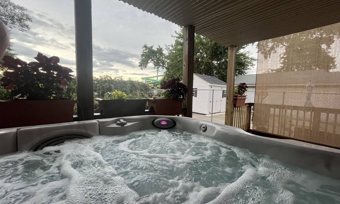 Views of the water park and Dunes in rear. Here you will find three bedrooms, with three modern bathrooms. Handicap accessible ramp, wide entrances in the back and the bathroom. Plenty of room for everyone. Home has two patio decks, cozy fire place on top deck with lounge chairs and tables with six chairs plus a huge hot tub on first floor deck. Bbq grill and fire pit on lawn conveniently located next to the deck on first floor. Inside you will enjoy a clean modern kitchen fully stocked. Five smart TV’s will be available to enjoy in every part of the house. Poker table/ bumper pool and even a retro arcade table will surely be entertaining for guests. High speed, Internet, for those that need to work or stream entertainment. Towels, shampoo, soap & fresh linens are provided. All new mattresses that are super comfortable. Private drive way, with additional off street parking. Centrally located, with access to major highways, NYC ferry and train station. Ring security cameras are placed in front and back of the house by both entry points for your safety. Please no unauthorized guests. 100$ per day per guest /visitors will apply for every unauthorized guest or visitor.