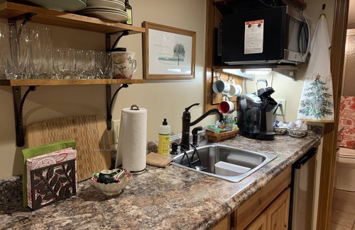 The small kitchenette includes a table & 2 chairs, large refrigerator, a small convection microwave oven (operates as an oven and as a microwave), dishwasher, a Keurig coffee maker, & a drip coffee maker, a sink with garbage disposal, toaster, electric skillet, 2 single induction ranges with pots and pans, and other essentials. Gas grill on back patio.
