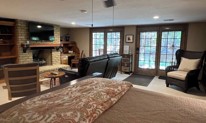 Our private studio apt offers you rest in your own wooded environment while close to the city. You will have your own private living space with private entry, Sleep Number Bed, kitchenette, full size refrigerator, dishwasher, bathroom, gas fireplace, full size washer & dryer, and covered patio w/fire pit table & chairs. Further out by the woods you will have your own fire pit with seating and wood.