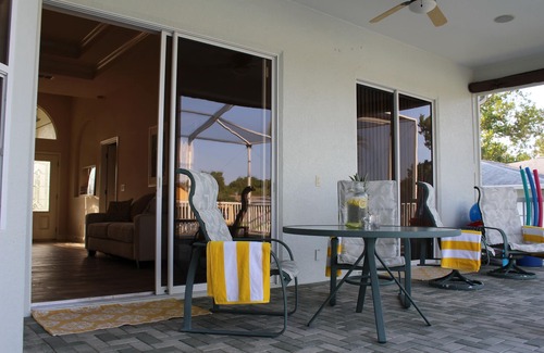 The home also has a beautiful, open kitchen which overlooks the main living room and the swimming pool, with views down the canal. The swimming pool and shaded lanai blend into the living room and also open into the master bedroom. The home come equipped with an alarm system to keep little ones safe from the pool. There is also a very large garage and sizeable driveway that should be able to accommodate most RVs or other large campers. There’s a large washer and dryer combo in the laundry room just off of the kitchen.