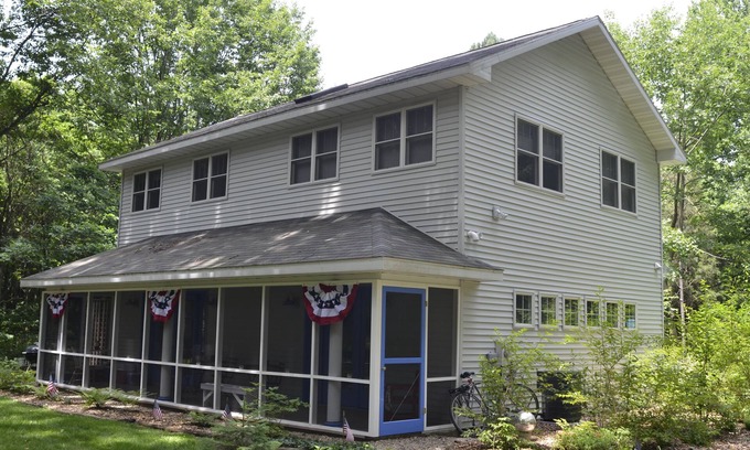We are located on the “lake” side of Red Arrow Highway on 2.5 secluded wooded acres. During the summer, it's a pleasant walk to the beach or ride one of the bikes we provide.