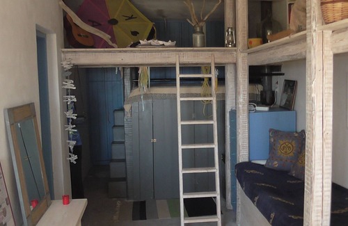 There is no need for air conditioning, as the Studio offers 24/7 natural coolness. Inside the Studio, a large loft and a traditional, island-style double bed at 1,80m above ground, a small cabinet room underneath it, create an extraordinary space.