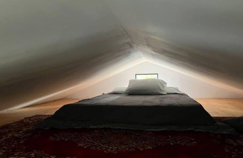 Open concept with one queen bed in the back end of the cabin separated with an open storage combination room divider. Traditional style living area with sofa bed, love seat and coffee table. Rustic library style ladder to access the cozy loft above where there is a queen mattress, if requested (the loft is open to below and not ideal for infants or small children without supervision). Modern/rustic 3 piece bathroom with spacious walk-in shower and vaulted ceilings. Galley style kitchen with a short L-shape peninsula with three bar stools. Dining table has seating for four people. 65” smart tv on a swivel wall mount with wifi to enjoy Netflix, YouTube, Disney etc. All with views out to our gardens and natural stone patio, fire pit and seating area through the large glass roll up door.