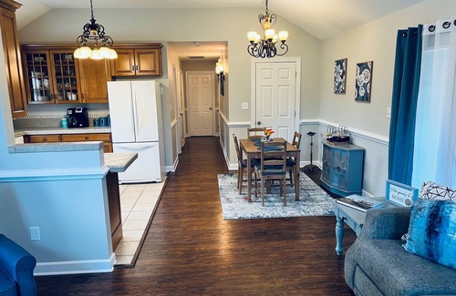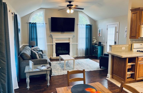 Private 2 bedroom 1 bath suite. Fully furnished with queen bed in master and twin trundle in the spare room. Living room, dining room, fully stocked kitchen with coffee pot, dishwasher, gas oven, microwave, and full size double refrigerator and freezer. Designated work space. Brand new stackable washer and dryer. Extra linens. Ironing board in walk-in bedroom closet. Your own private screened in porch. Keyless entry next to your own parking space. Gas fireplace. TV with Firestick in living room and Roku in master.