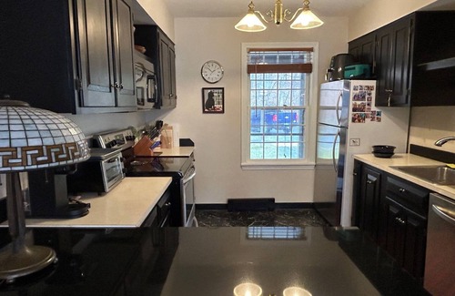 Fully equipped kitchen with coffee maker, dishwasher, and air fryer