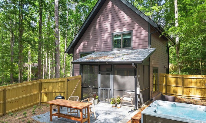 The Woodstock Botanical Retreat is a modern backyard cottage surrounded by towering trees and filled with lush plants, original art, and curated comfort. Just minutes from downtown Woodstock, this private escape features a screened porch, smart lighting, luxury touches, and a hot tub under the stars. Enjoy fast Wi-Fi, a level 2 EV charger, a chef-ready kitchen, and cozy nooks for reading, relaxing, or reconnecting.